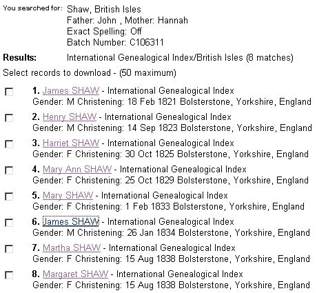 Going back to the search screen and entering "John" as the father and Hannah as mother brings