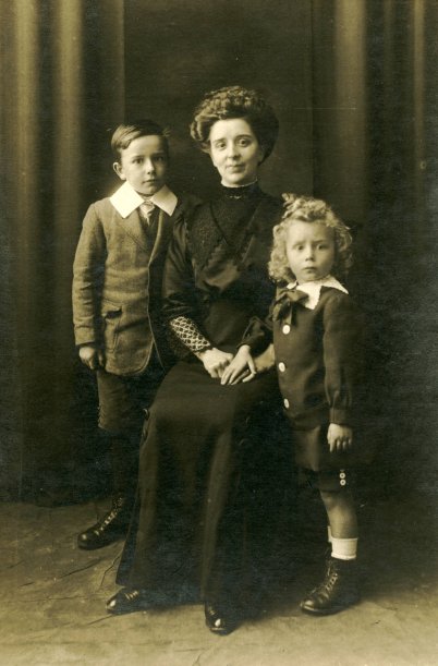 Eliza Woodcock (1888 - 1974) nee Hattersley, daughter of the William & Sarah above, with her sons Christopher and Douglas. Photo taken on Dec 12 , 1916. Eliza is pregnant with my mother