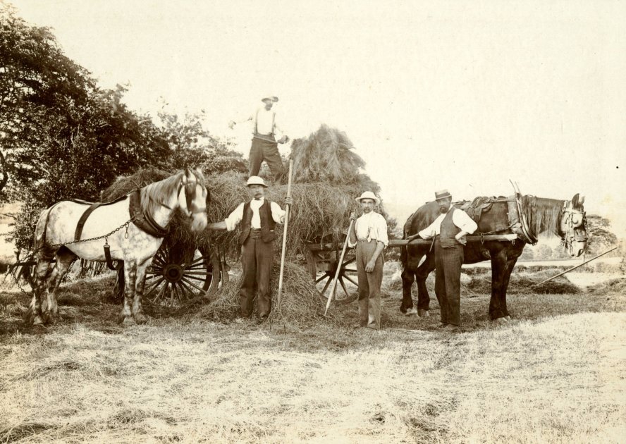 Christopher Woodcock (b Bradfield 1847 - 1918 interred at Wadsley) to the right with his two sons Arthur (to the left, who married Eliza Hattersley) and Fred in the centre. Man on load unrelated. Photo taken in Wentworth, probably Manor Farm.